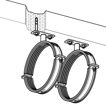 Rohrschelle Stabil D-3G m.E. passend für die Dimensionen 40 bis 315 mit Grundplatte und zwei Bolzenankern M10. Ab der Dimension 200 sind immer zwei Rohrschellen sowie zwei Grundplatten mit vier Bolzenankern M10 enthalten.