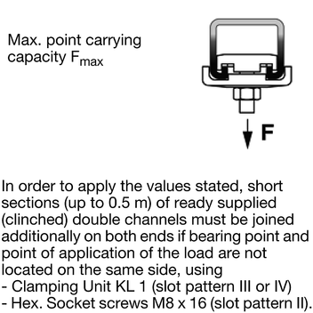 | * | Double channels with max. length up to 0,5 m should be connected at both ends, if bearing and point of load incidence are not on the same side: Slot pattern 2: with Hexagon socket screw M8 x 16 Slot pattern 3 or 4: by means of Clamping Unit KL 1. |
