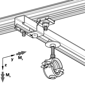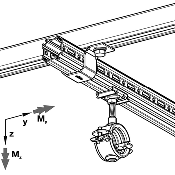 Connection of a Profile PRO 46 to a beam section TP F 80 or 100 with self forming screws FLS F. The combination of the Profile PRO 46 and Channel MS 41 is made using speed nuts. The cross connection of the Channel MS 41 to the Profile PRO 46 is made on both sides with the block PBH 46.