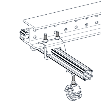 Connecting element for fastening the Profile PRO 46 to steel beams facilitating perpendicular of cantilever connection.