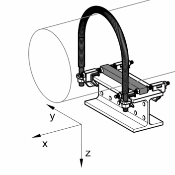 Position the preassembled clamping hooks onto the beam flange and tighten the nuts (to 10 Nm). For beam width < 100mm the 4 nuts of the PA bearing block have to be removed. Fasten U-bolt to the clamping hooks with the nuts included (to 50 Nm). The pipe is pressed against the PA bearing block.