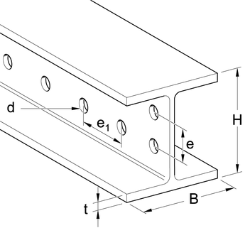| Type | H [mm] | B [mm] | t [mm] | d [mm] | e [mm] | e1 [mm] |